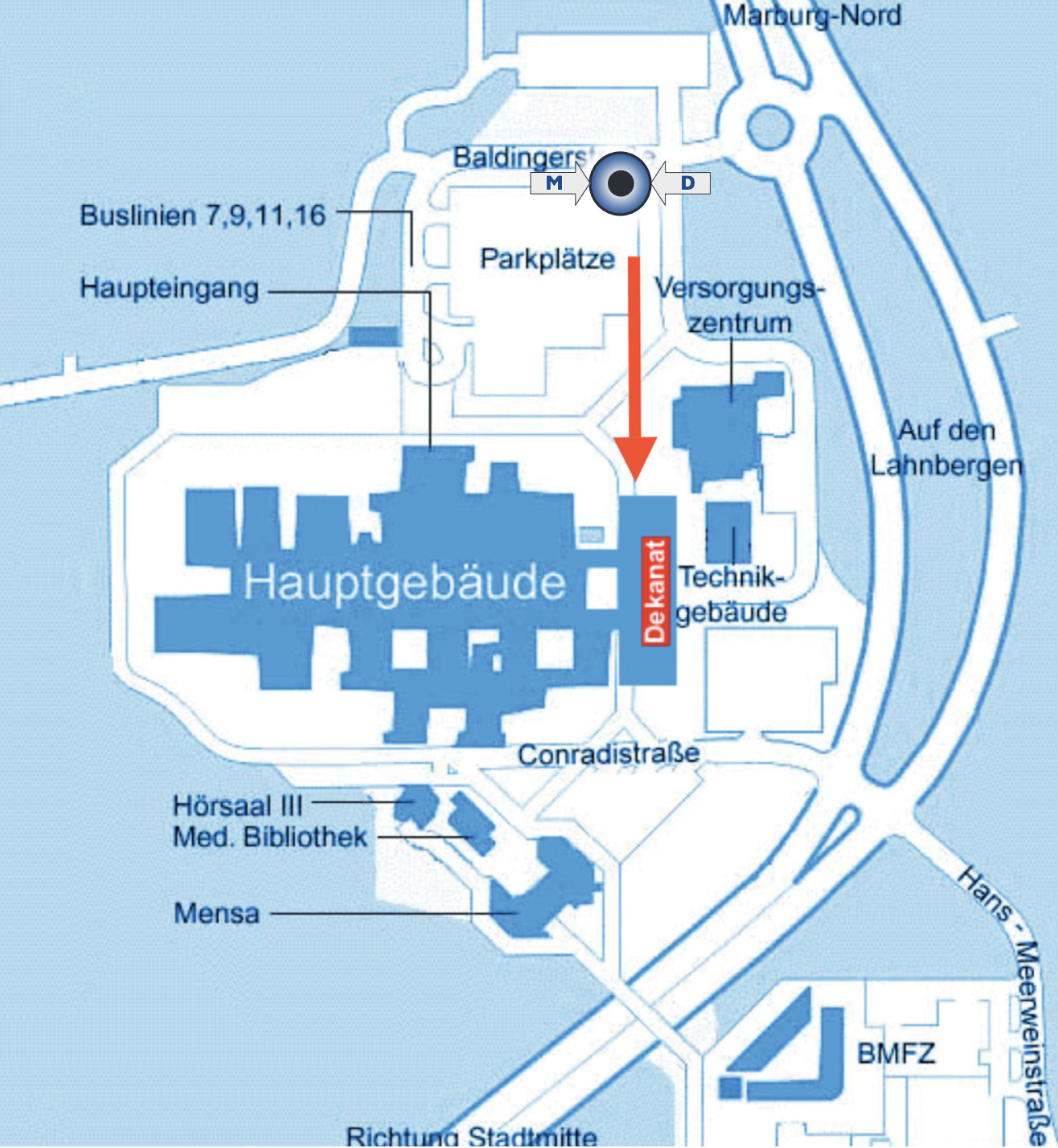 Von Marburg-Hauptbahnhof erreichen Sie die Klinik mit der Buslinie 7 in Richtung